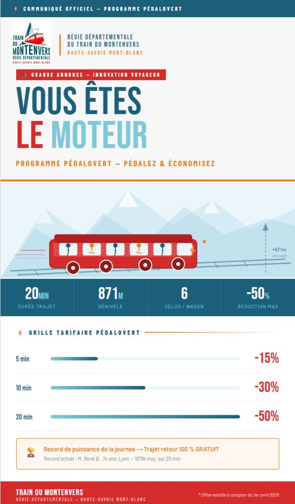 La Régie Départementale du Train du Montenvers innove : le train passe à l’énergie des voyageurs La Régie Départementale du Train du Montenvers est fière d’annoncer le lancement de son programme « PédaloVert », une initiative inédite en Europe qui repositionne le voyageur au cœur de la transition énergétique. À compter du 1er avril 2026, chaque wagon […]